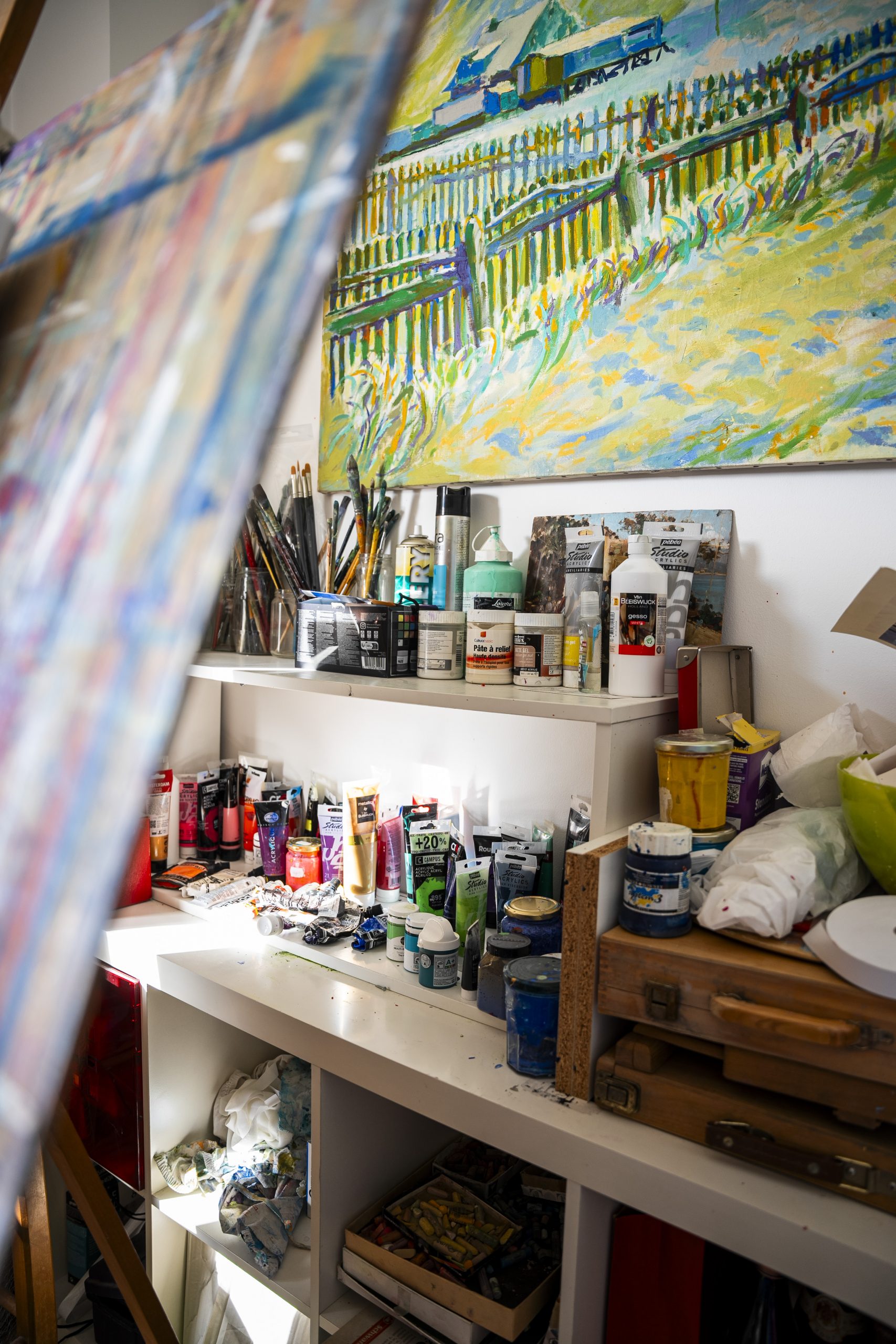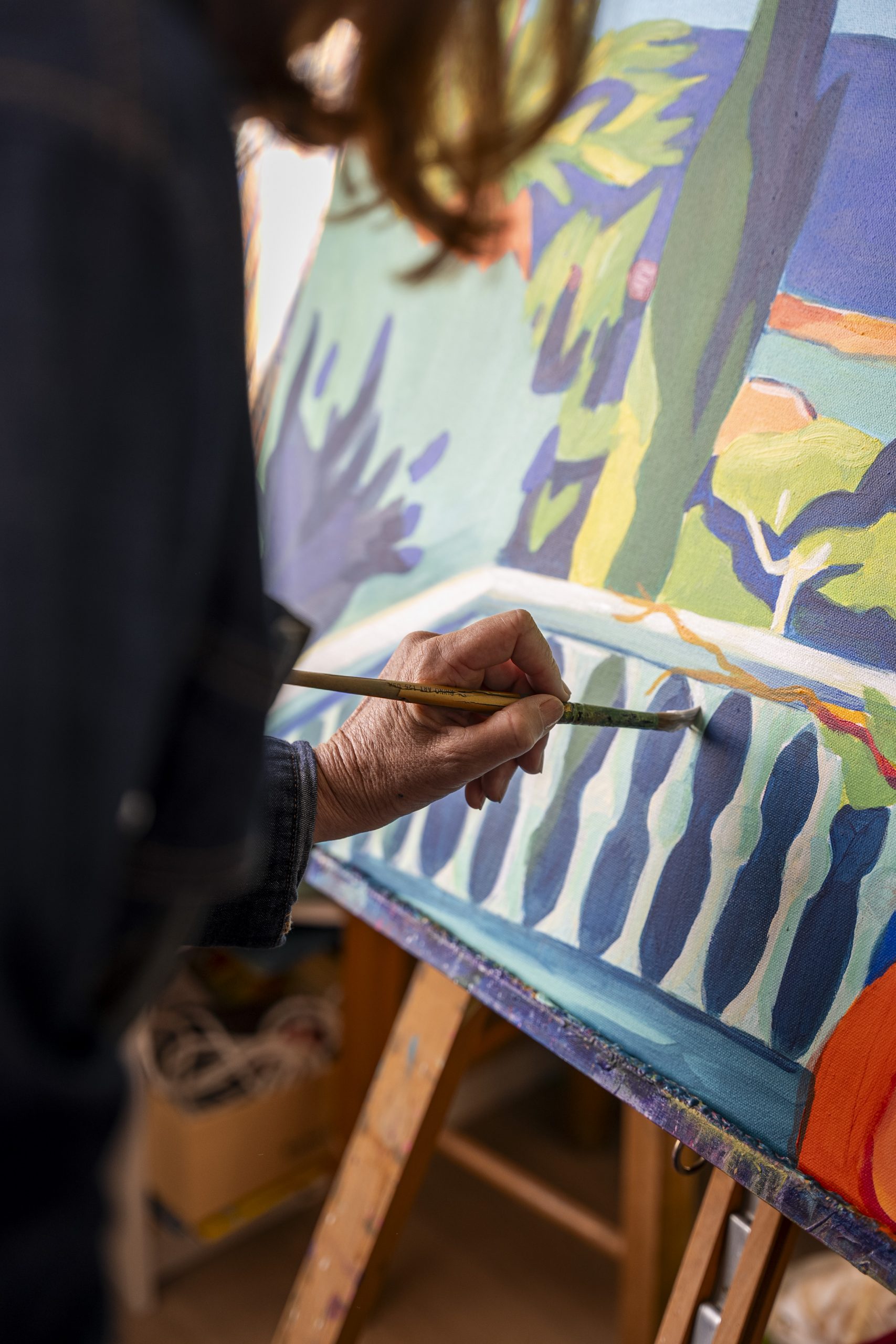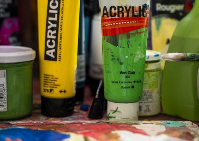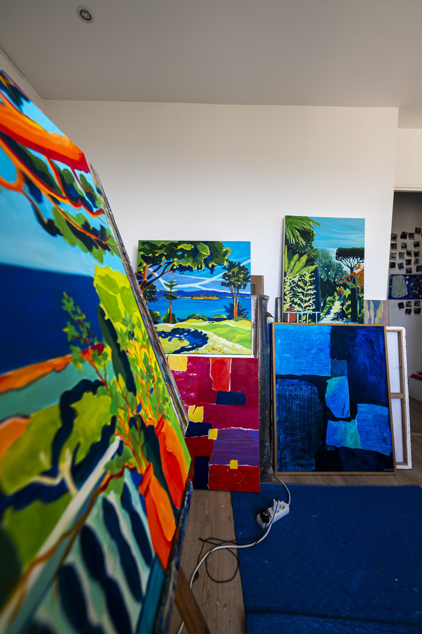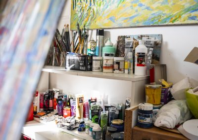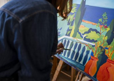 Sa pratique mêle acrylique, pastel sec, aquarelle et collages peints, créant des compositions qui respirent la lumière et l’énergie.