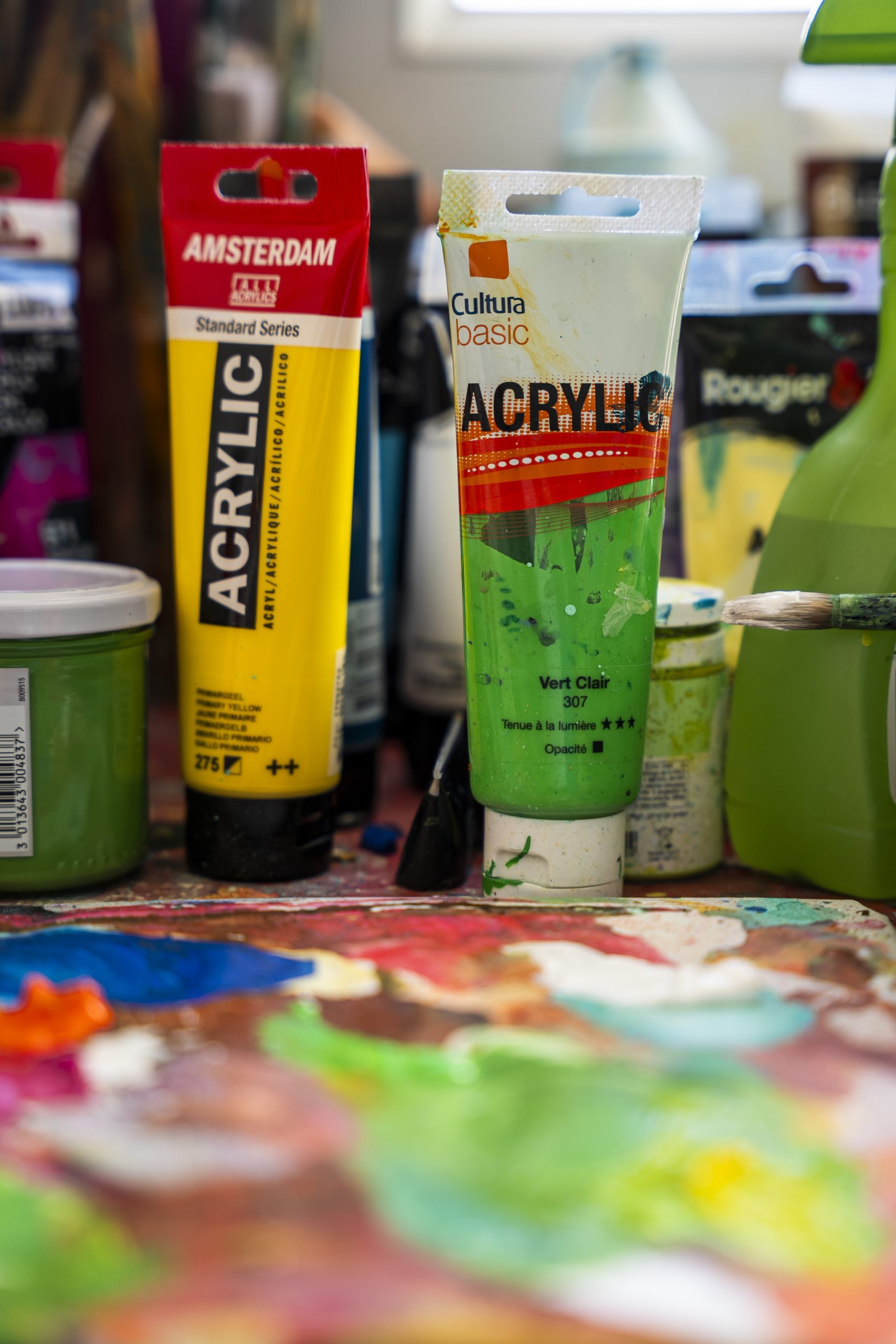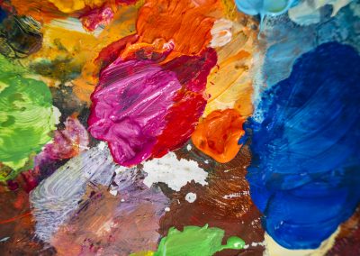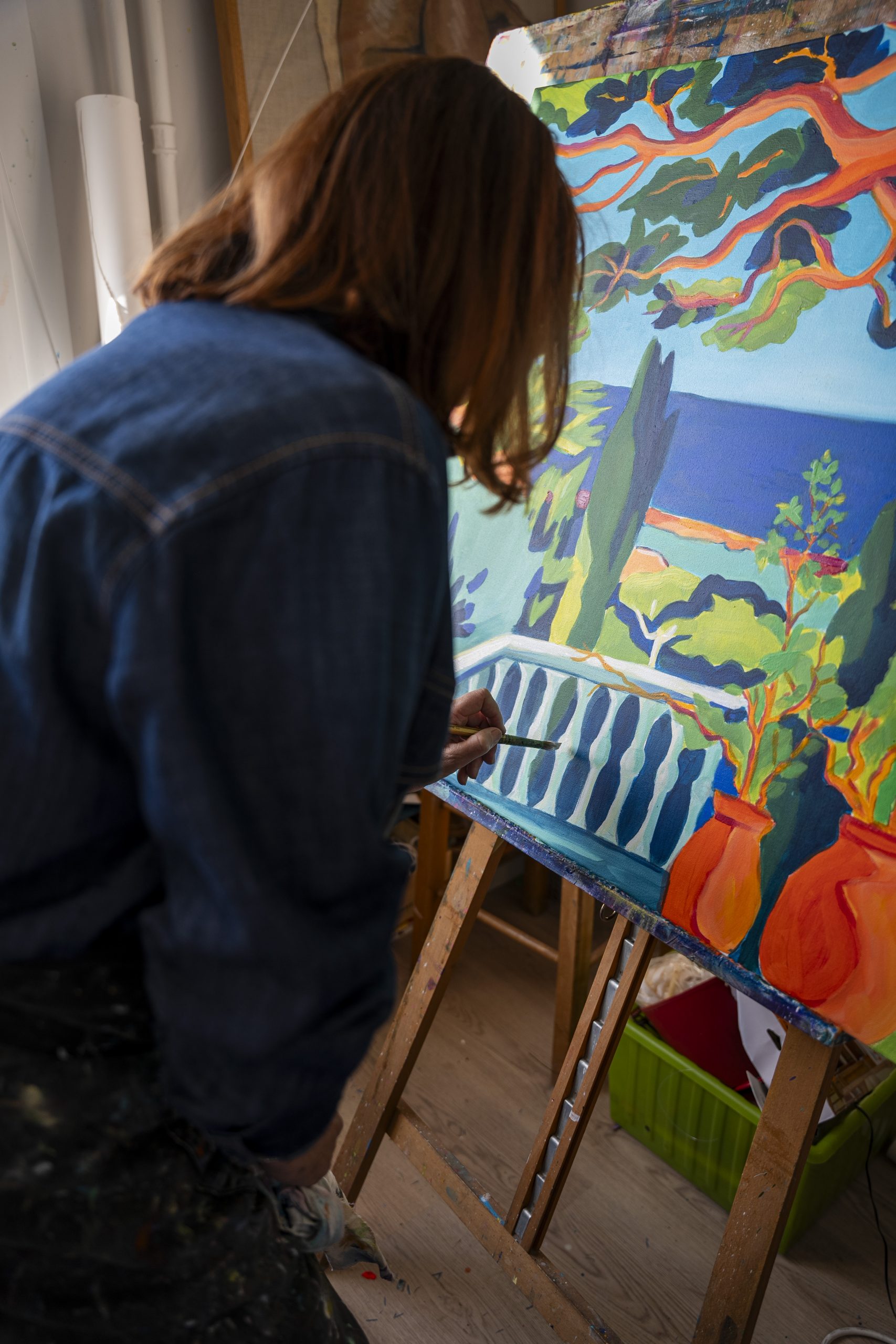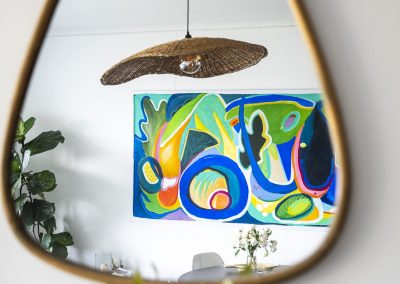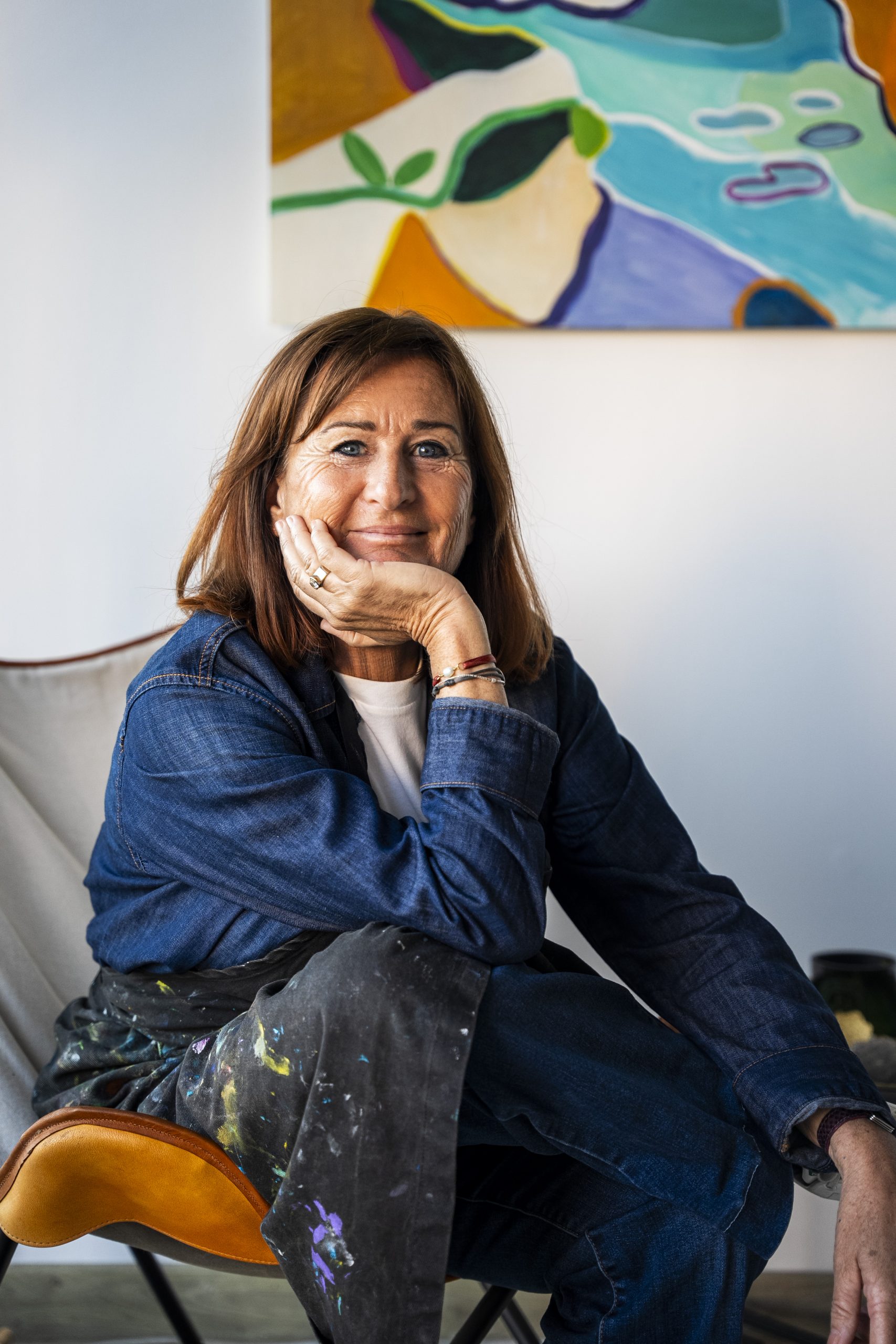 Sa pratique mêle acrylique, pastel sec, aquarelle et collages peints, créant des compositions qui respirent la lumière et l’énergie.