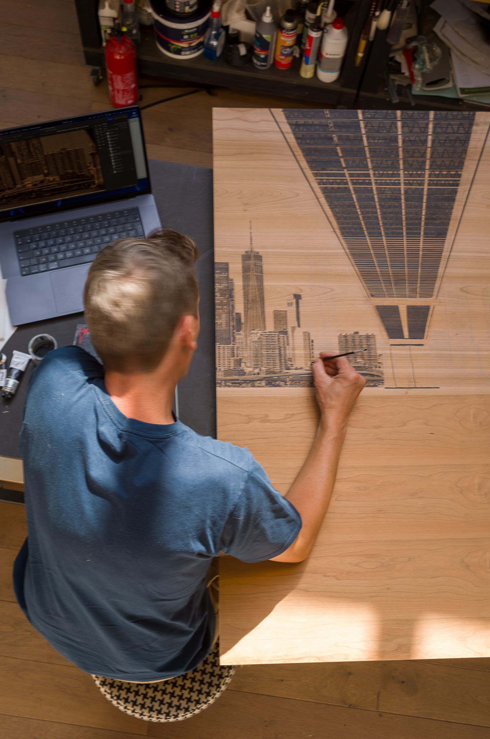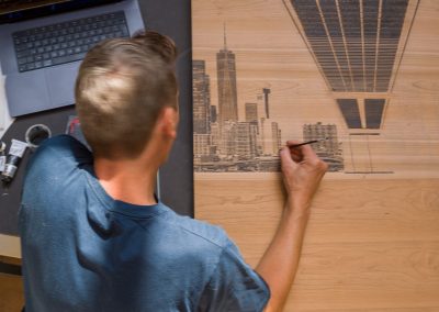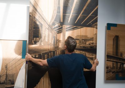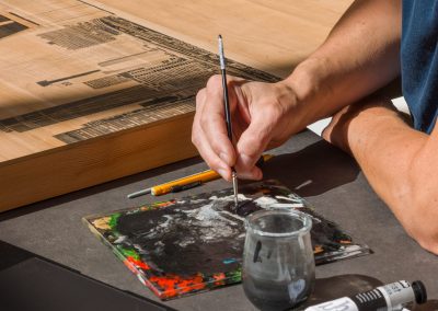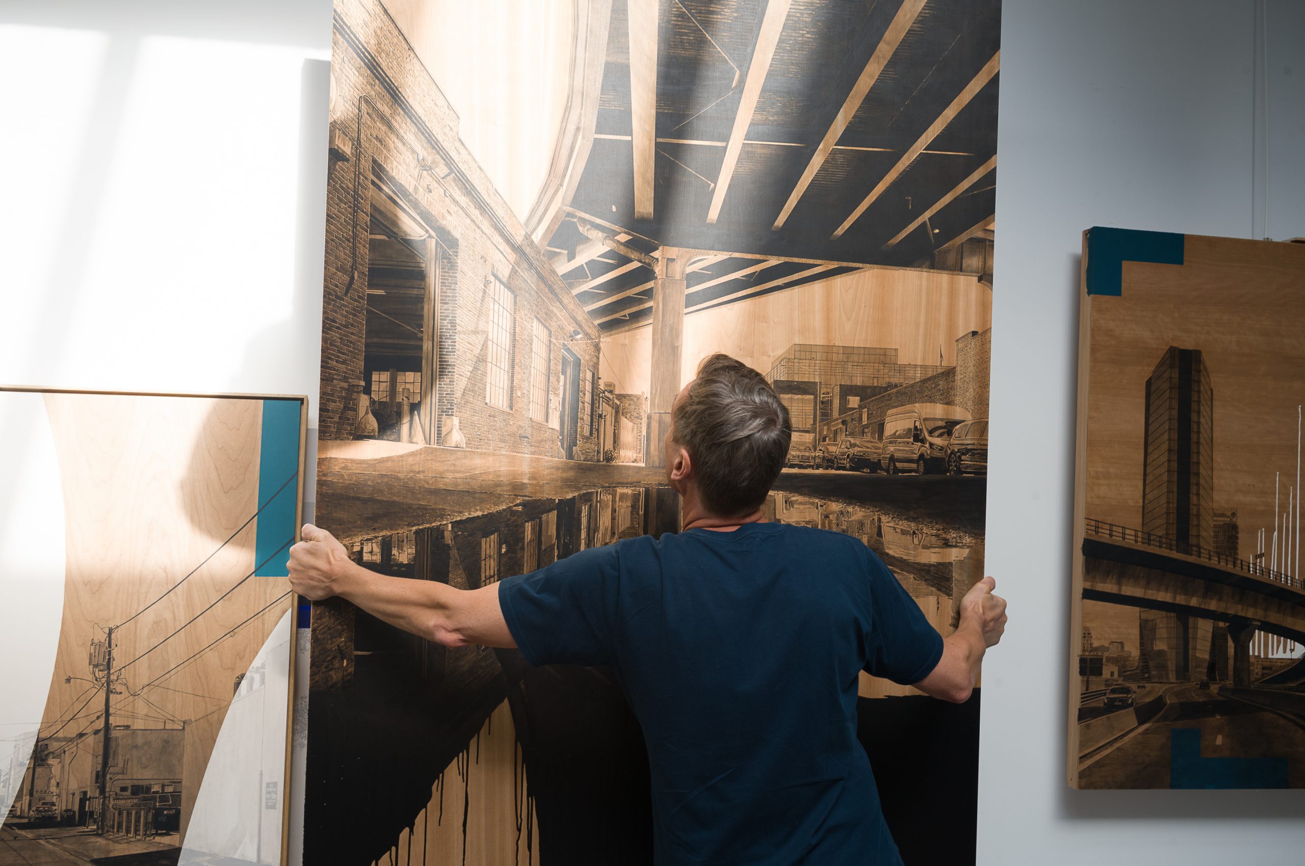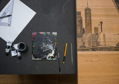 Ses œuvres, réalisées sur bois noble, conjuguent hyperréalisme et abstraction, jouant des contrastes entre la matière brute et des aplats monochromes.