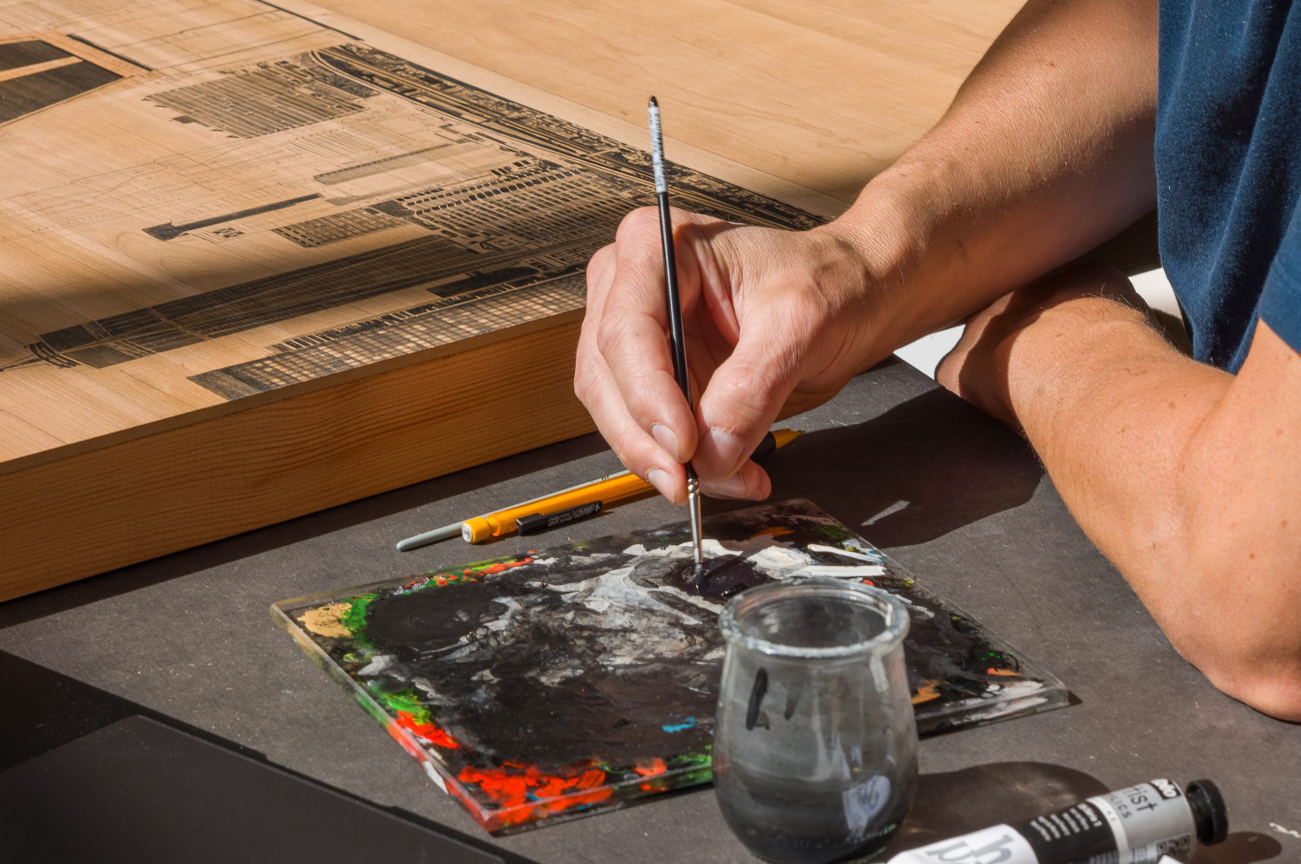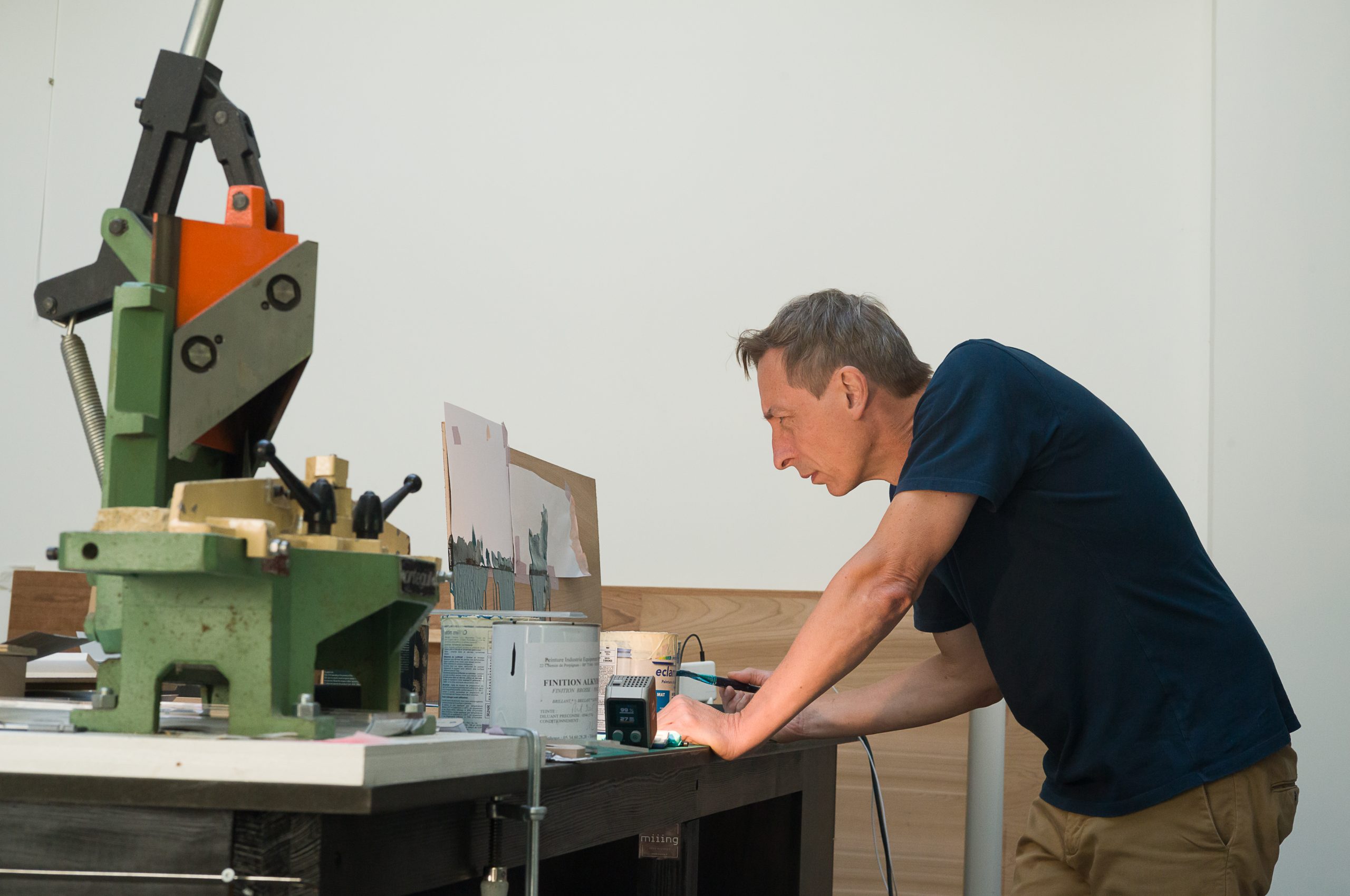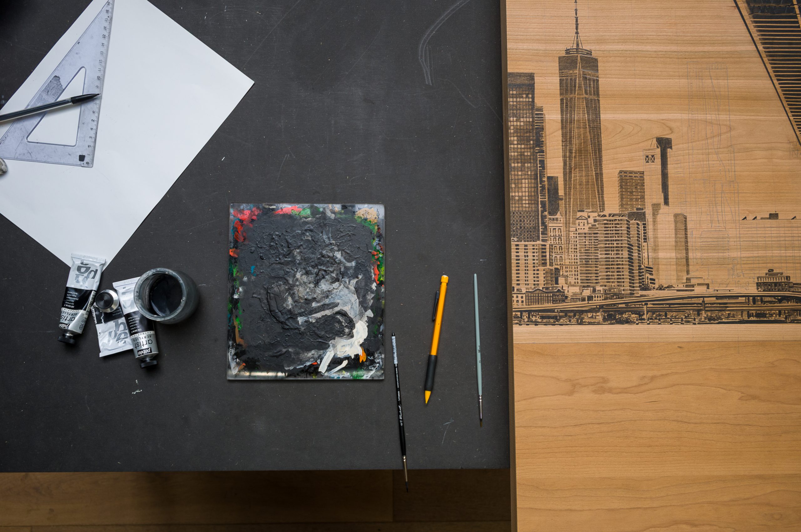 Ses œuvres, réalisées sur bois noble, conjuguent hyperréalisme et abstraction, jouant des contrastes entre la matière brute et des aplats monochromes.