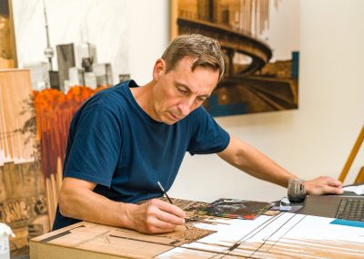 Inspirées de ses voyages à travers les mégapoles du monde, ses compositions fixent l’énergie urbaine dans une tension subtile entre mouvement et silence.
